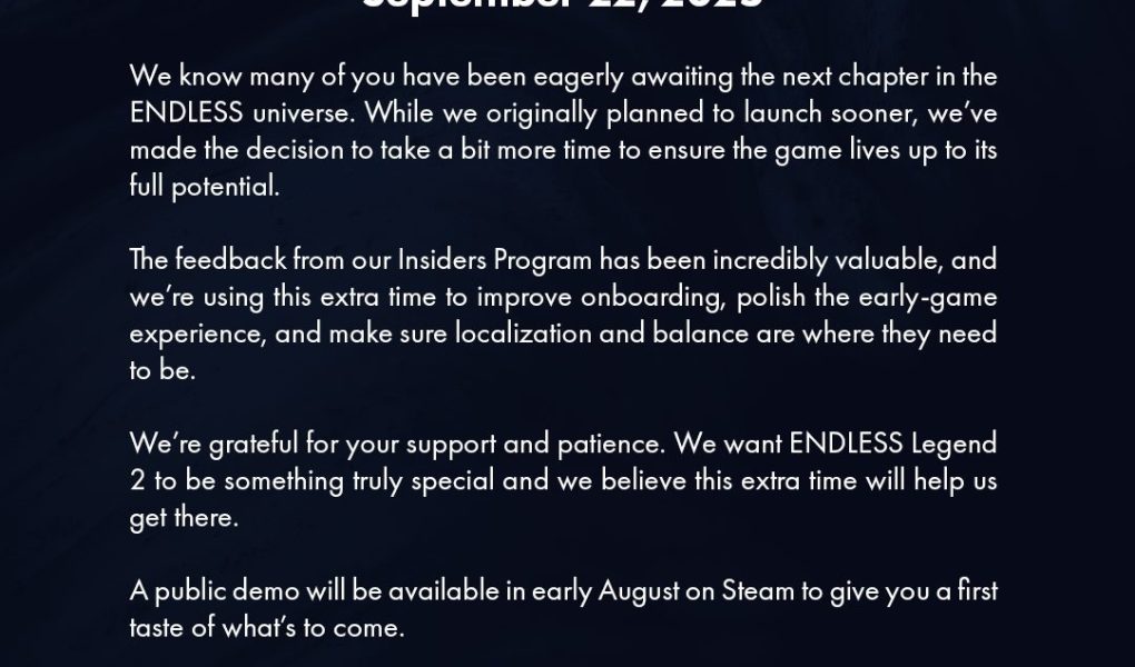 Amplitude Studios ha comunicato che l’uscita di Endless Legend 2 in Accesso Anticipato è stata posticipata. Inizialmente prevista per l’inizio.