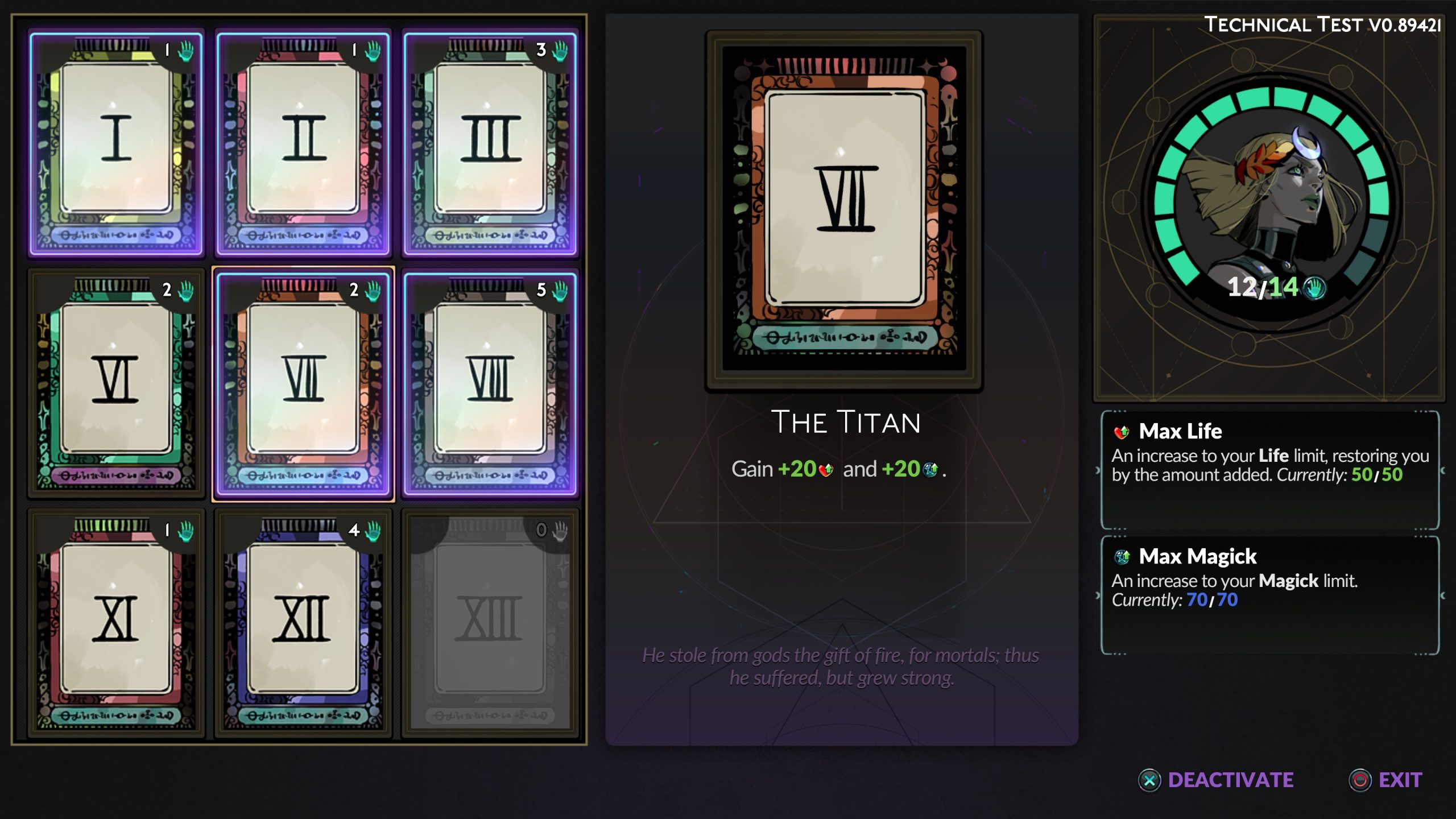 Una volta sbloccata una carta, dovrai anche attivarla per usufruire dei suoi vantaggi, con ogni carta che ha un costo di Grasp diverso. Melinoe inizia con solo 10 Grasp, ma potrai potenziarlo in seguito utilizzando la Psiche, e ogni carta costa tra 1 e 5 Grasp. Esistono anche carte speciali di Risveglio che non costano nulla e si attivano automaticamente in base a determinate condizioni.